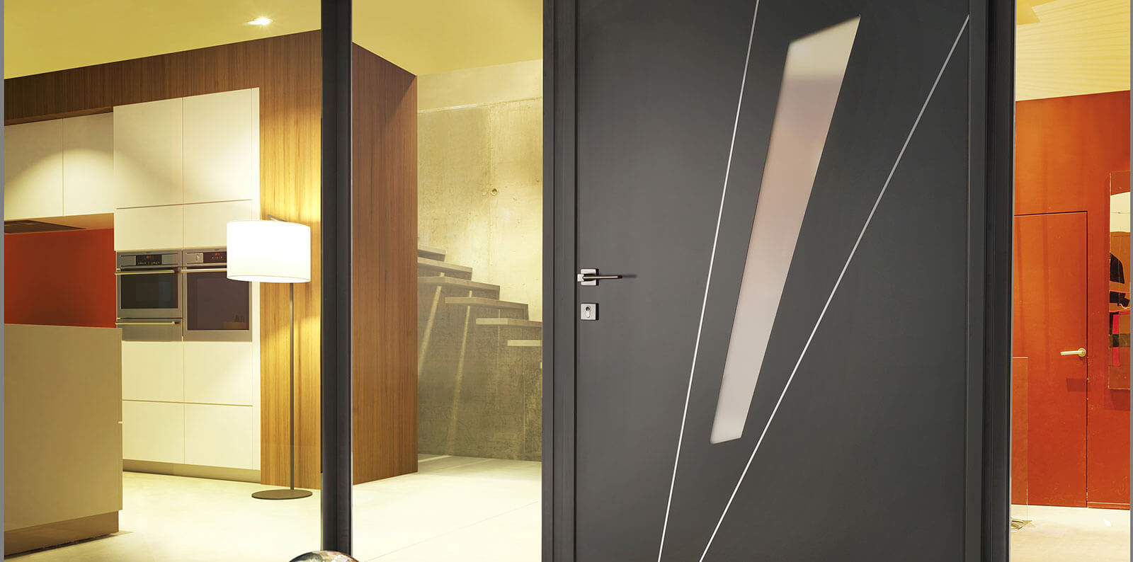 Porte d’entrée monobloc de 85 mm d’épaisseur à ouvrant affleurant côté extérieur.